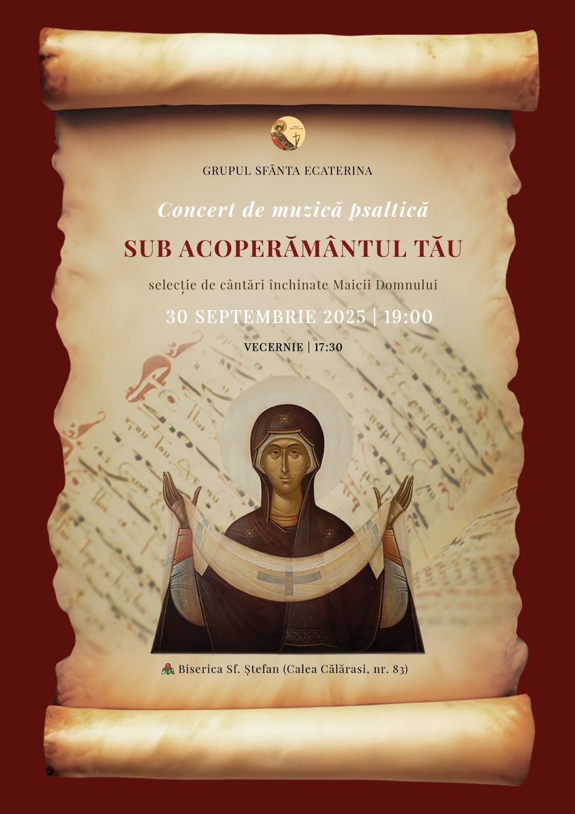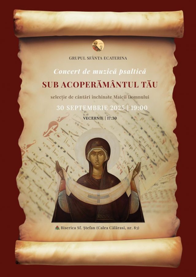 Grupul ”Sfânta Ecaterina” va susține un concert dedicat Maicii Domnului, având tema „Sub acoperământul Tău”. În cadrul acestui eveniment spiritual-cultural, credincioșii vor putea audia o selecție de cântări psaltice tradiționale, interpretate cu solemnitate, evlavie și profundă dăruire. Repertoriul cuprinde lucrări de o aleasă frumusețe, inspirate din bogata tradiție bizantină, aducând cinstire celei care este ocrotitoarea și mijlocitoarea tuturor creștinilor.