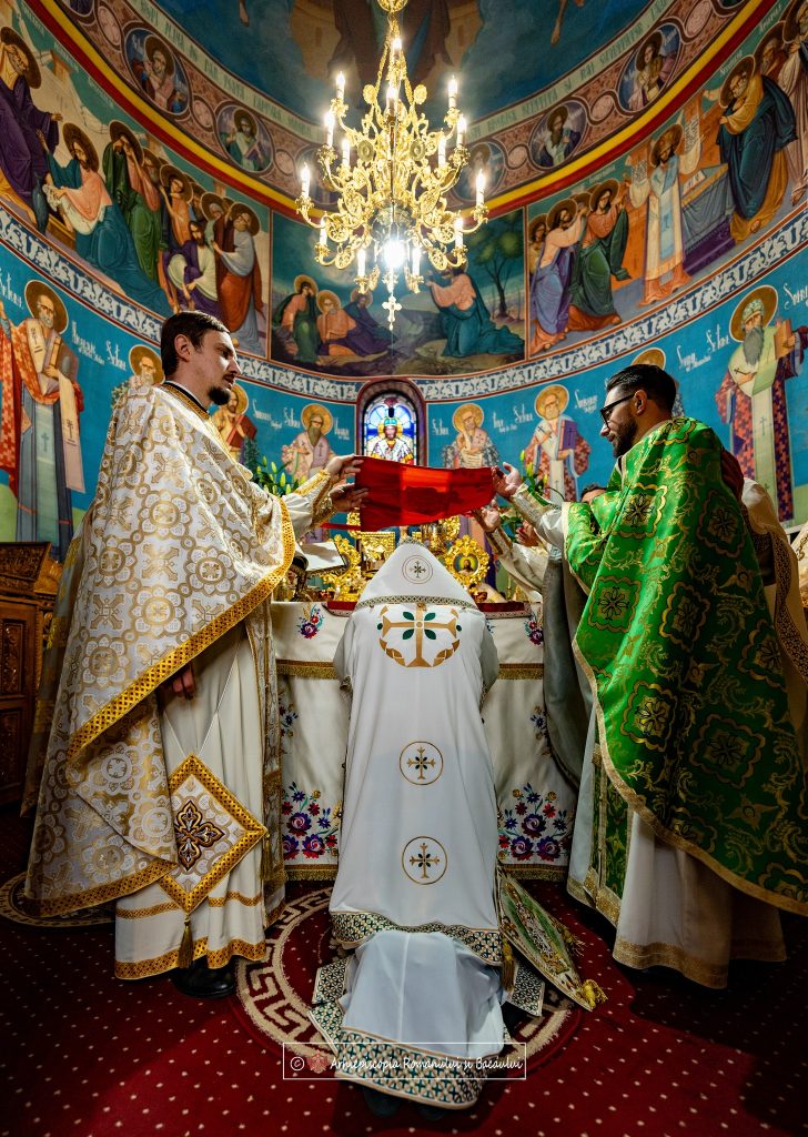 „El este adus în fața Sfântului Altar, îngenunchează în fața Sfintei Mese, care simbolizează mormântul Domnului și acolo stând în genunchi, cu capul plecat pe colțul drept al Sfintei Mese, precum a stat odinioară Evanghelistul Ioan pe pieptul Mântuitorului Hristos, se roagă și primește harul Preasfântului Duh de a sluji Sfântului Altar.”