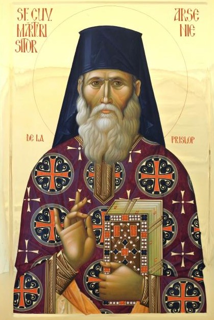 „Sfinte Cuvioase Părinte Arsenie, mărturisitorul dreptei credințe, povățuitor înțelept al credincioșilor pe cărarea împărăției, și de minuni făcătorule cel ce în vremuri grele ai strălucit, roagă-te lui Hristos Dumnezeu să mântuiască sufletele noastre.”