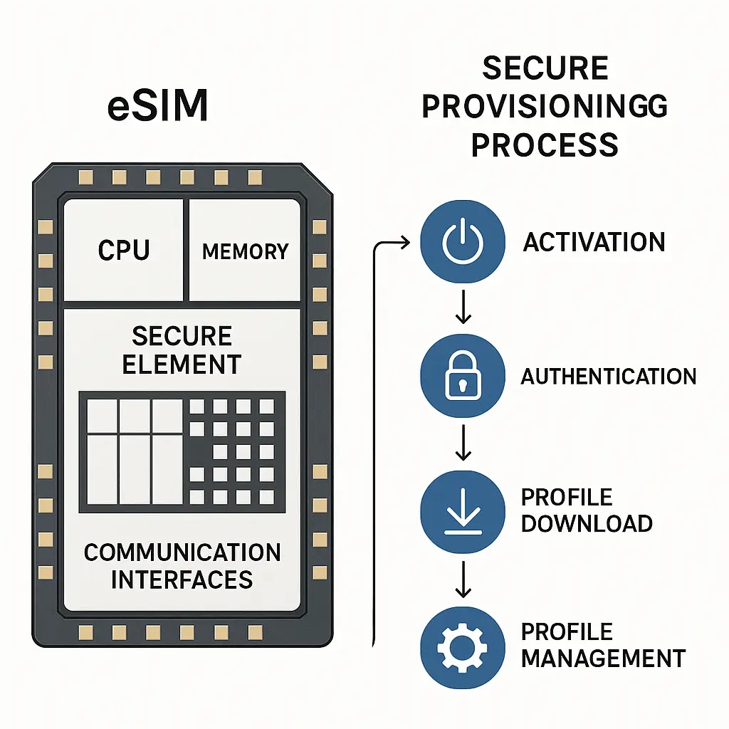 Each eSIM includes a unique eUICC ID (EID) assigned at manufacturing, which underpins secure provisioning. The Local Profile Assistant (LPA) on the device initiates communication with a Subscription Manager (SM) to download or switch network profiles securely—no carrier store visit, no physical SIM, and far fewer attack vectors.