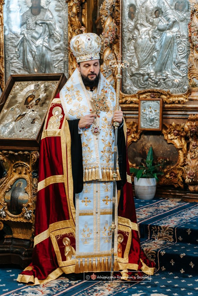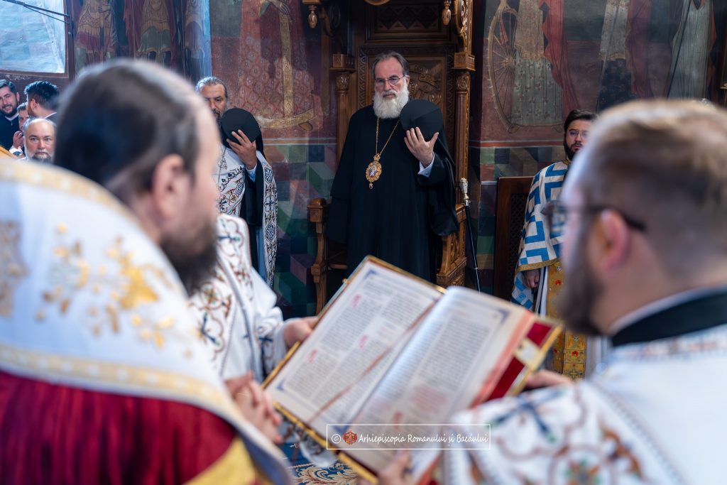 Slujba a fost oficiată de către Preasfințitul Părinte Teofil Trotușanul, Episcop-vicar al Arhiepiscopiei Romanului și Bacăului, cu binecuvântarea Înaltpreasfințitului Părinte Ioachim, Arhiepiscopul locului. În altarul Catedralei s-au aflat, alături de ierarh, și pr. arhim. Pimen Costea, vicar eparhial, împreună cu un sobor de preoți și diaconi slujitori.